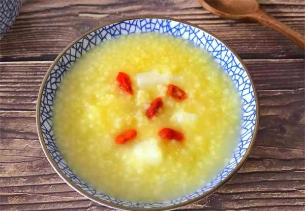 步骤二:锅中烧水,水开以后下入小米,水米比例1:10,搅拌防止糊锅,搅拌均匀,煮10分钟以后搅拌,把切好的雪梨和山药下锅,搅拌均匀,大火熬煮半个小时,快出锅时加点枸杞,即可。