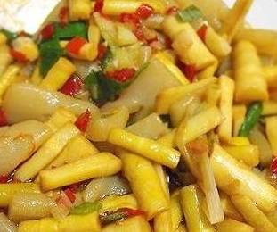 4、再加入魔芋和笋丝快速的翻炒几分钟,然后加入味汁翻炒均匀。