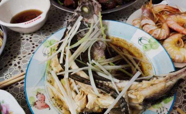 清蒸鲈鱼,一条鲈鱼个头很大,这样的鲈鱼对广东人来说也是经常吃的,会烹饪得非常精致,鱼肉鲜美弹牙,鲜味十足,而山东人豪放,直接放点葱,蒸熟就可以了。