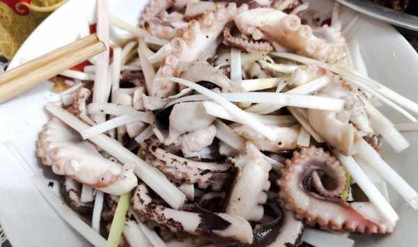 八带,同样是用最简单粗暴的方式,用水煮,切成段,放点大葱丝,淋上一点味极鲜就上桌了,八带虽然很新鲜,广东女孩还是迟迟不敢下筷子。