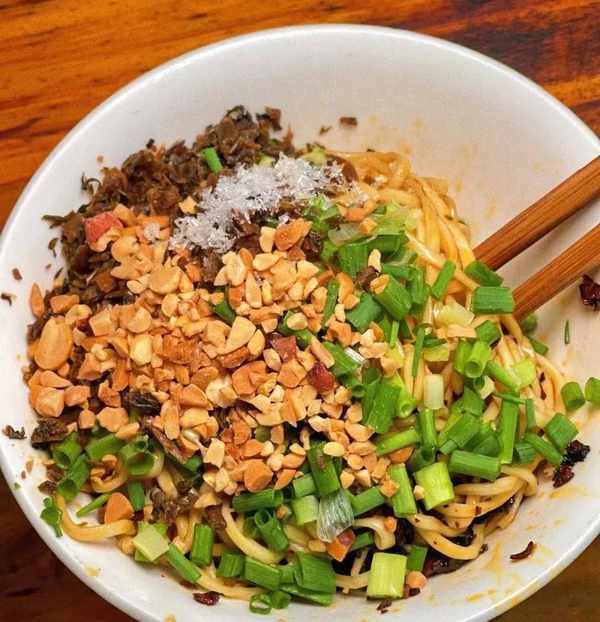 其做法不算复杂。先将面条煮熟后拿出甩干,然后加入香油、辣椒油、酱油等调味料拌匀,最后撒上葱花、花生碎、肉沫,宜宾燃面便做好了。