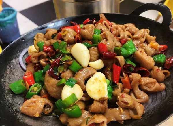 用的是猪大肠最下面的那段肠,这道菜难的不是做法,是洗大肠,是真的臭,但是如果想要完全地把味道给洗干净也不是没可能,但是出锅后会少些味道,恰到好处是最好,然后加上湖南本地特制的辣椒酱,鲜香辣爽、色泽红亮,光是闻到味道就流口水了。