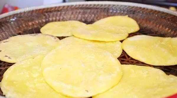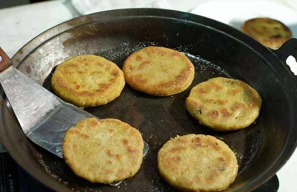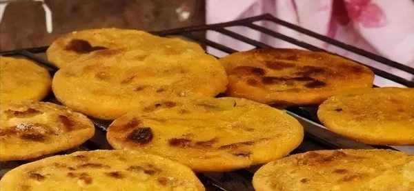 是安徽徽州山区有名的特色小吃,是以山区产的山苞芦为主要原料制作的,山苞芦是山上种植的一种玉米,是将玉米磨成粉后制作面皮包上鲜菜和腌雪里蕻制成的內馅后在锅中烙熟即可,口感香甜,浓郁的玉米清香味道加上内馅的清真,尝过都会觉得很有风味[吻]