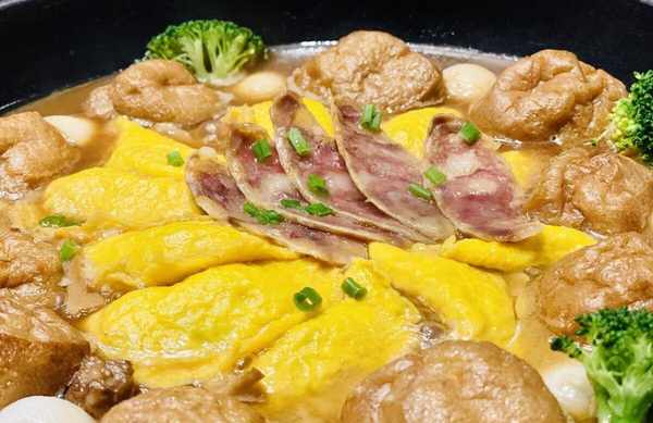 将做好的蛋饺、羊肉、豆腐、炸豆腐等食材,不断焖煮加汤制成,看似简单,其