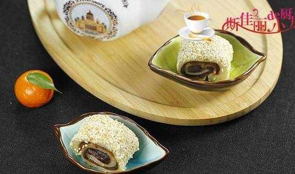 7.保鲜袋中滴入几滴油,搓匀,再将蒸熟凉后的糯米面团放入保鲜袋中;8.用擀面杖将它擀成厚薄均匀的面片,再剪开保鲜袋的两角;9.将豆丝馅料均匀的涂抹在糯米面片上;10.这样提着保鲜袋的一边就可以向内将它卷起来;11.卷到最后一段时撒上熟白芝麻,让其均匀的裹在面团上;12.再切成小块即可;