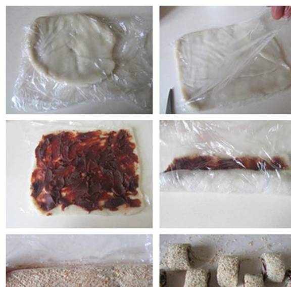 驴打滚按照传统的方法,就是将糯米面团蒸熟后放在案板上,趁热将面团撑开,再在上面涂抹上豆沙馅,然后就卷起来后将糯米面团放在黄豆面中滚一下,切块即可。但是每回这样做就觉得很麻烦,一是要撑热撑开面团,好烫;而是做好后案板上总是又脏又乱,太难清洁。