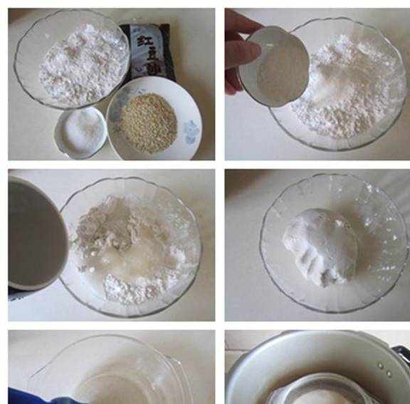原料:糯米粉1碗豆沙馅1小碗糖少许芝麻少许