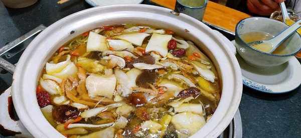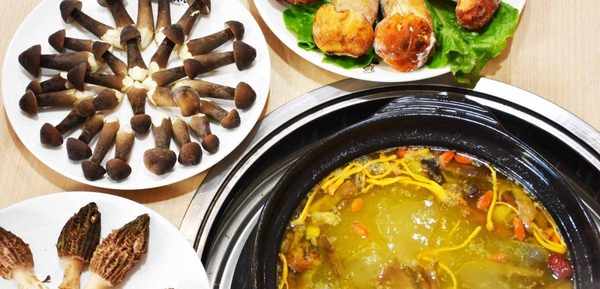 野生菌火锅的主要食材是母鸡,通常选用的是农家所养的母鸡,这种鸡纯天然零添加,肉质非常紧实。野生菌火锅中有各类菌菇,加上高汤进行炖煮,烹饪完成后的美食散发着浓郁的野山菌香味,吃起来非常可口。