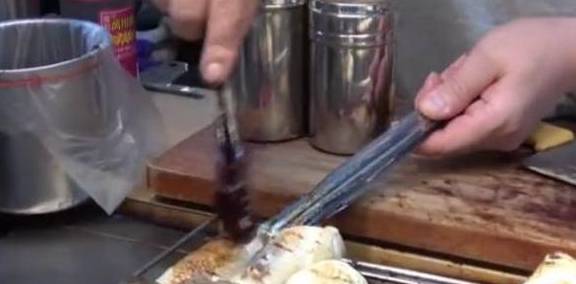接着就是在上面不断的刷上各种烧烤的料子,边烤还边用刀在试烤的程度,只有老板才能把握这烤杏鲍菇的最佳口感,他感觉能吃的时候就可以在上面刷上一层烧烤酱,然后放在案板上切成小块,最后在放上一些胡椒粉,这样一份烤杏鲍菇就做好了,一份3根,量很足,足够你吃饱了,因为每一根杏鲍菇的个头都是很大,很多人表示没见过,但是尝过后都会抢着卖!所以老板的生意越来越好!中年男子下岗后摆摊卖“它”很多人没见过!尝过后都抢着买!