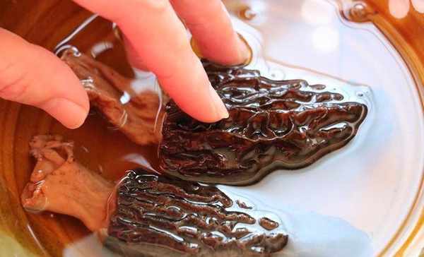 羊肚菌冲洗干净以后,将其放在容器里,加入45摄氏度的温水,水要可以没过羊肚菌。如果浸泡羊肚菌的水温太烫会破坏羊肚菌的营养,使营养成分流失;若水温太低,则无法激发出羊肚菌的香气,所以浸泡羊肚菌的水温非常重要。