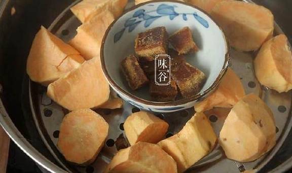 1、红薯去皮后切块,红片糖敲成小块放碗里。一起放进锅内蒸15-20分钟;