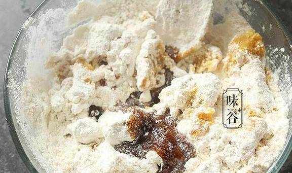 4、再把已经蒸融化的糖浆倒入面粉内;