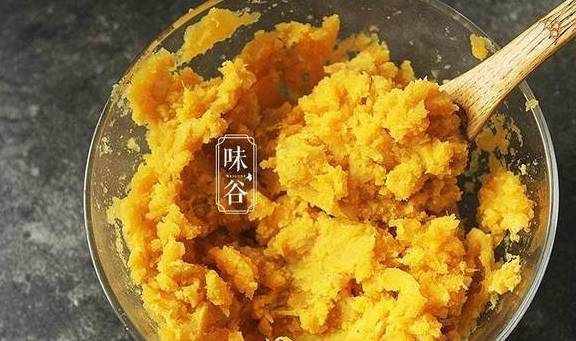 2、红薯蒸好后,用勺子压成泥;