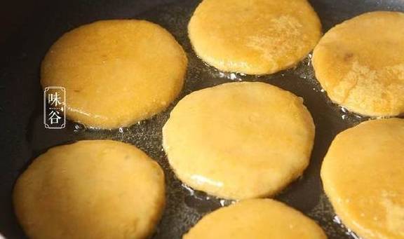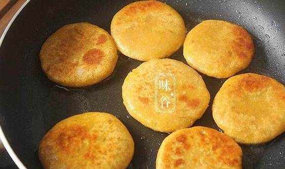 7、平底锅内倒入多一点点油,放红薯饼中小火慢煎;