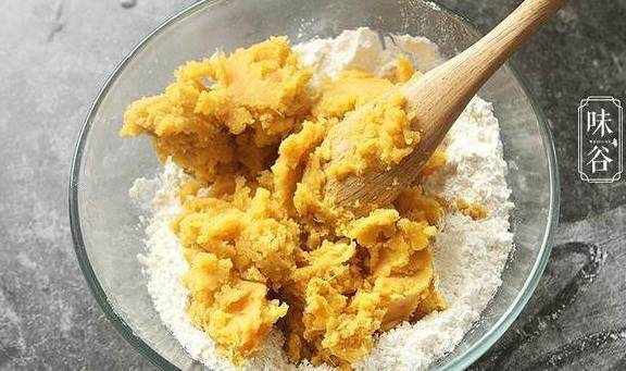 3、把红薯泥倒进面粉内,搅拌一下。