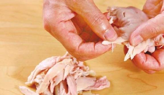 2离火泡凉,捞出沥干,用手将鸡肉撕成不规则的条。