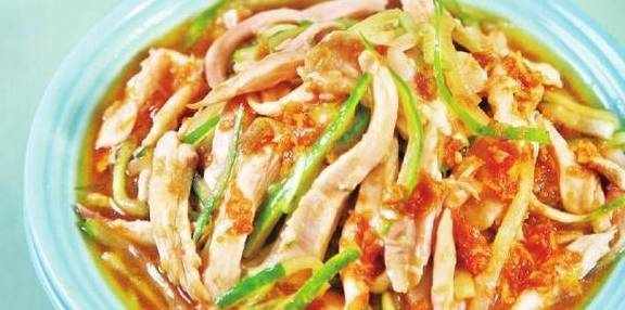 原料:净肥鸡1/2只,黄瓜150克,蒜瓣20克,生姜3片,葱结1个