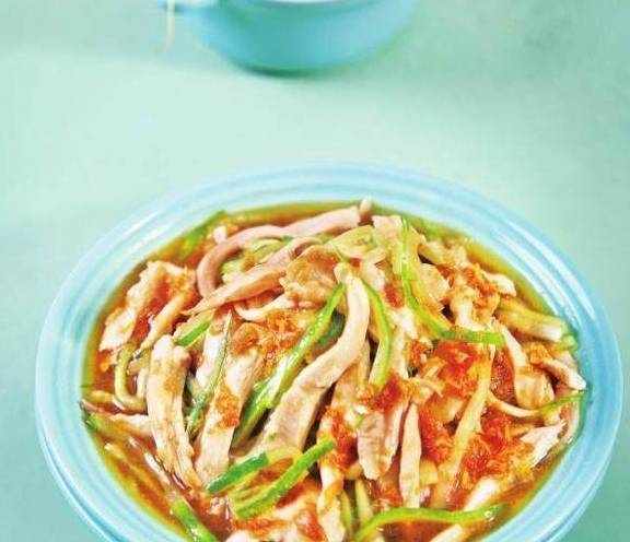 ②鸡煮好后用原汤浸泡冷却,让其吸足水分,成菜才会皮爽肉滑。