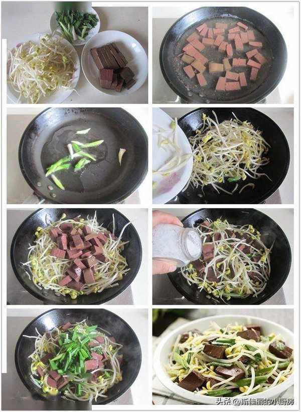 制作:1. 准备好食材; 2. 烧锅水将鸭血块焯一下去腥; 3. 烧热锅放入少许油,将青蒜白进去翻炒出香味; 4. 将洗净的黄豆芽放进锅中翻炒几下; 5. 加入焯好的鸭血进去翻炒几下; 6. 加入少许盐调味翻炒均匀; 7. 再加入青蒜叶翻炒均匀; 8. 盛入盘中。