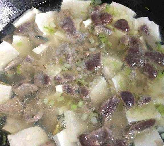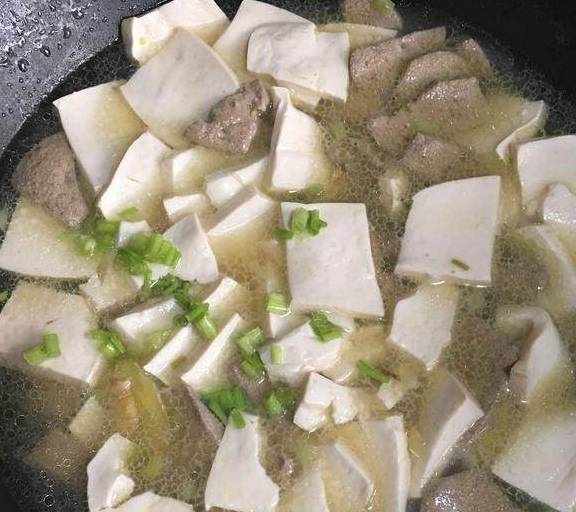 材料:猪肝200克,嫩豆腐一块,葱花,姜片,生粉(玉米淀粉)调料:植物油,盐,鸡精