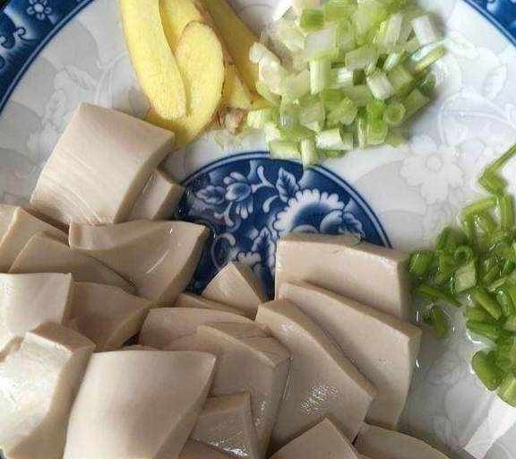 2.嫩豆腐也切片,准备好姜片,葱白与青色的葱切好分开;