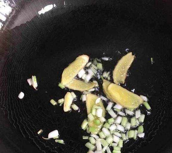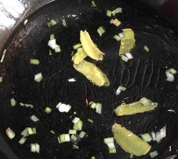 3.热锅入油,烧至5成热时下入姜片和葱白,小火炒香;