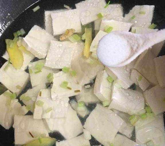 5.下入豆腐,加入一勺盐,用锅铲轻轻推匀;
