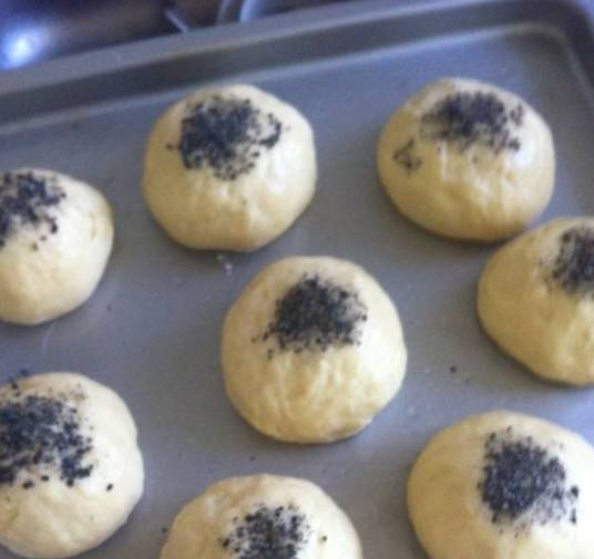 7.把发酵好的面团挤出空气,揉成长条,按要求分成所需份数,揪成大小乒乓球那么大的剂子,揉圆后刷一层稀释过的蜂蜜水,撒一些芝麻,最好是白芝麻。静置十分钟。