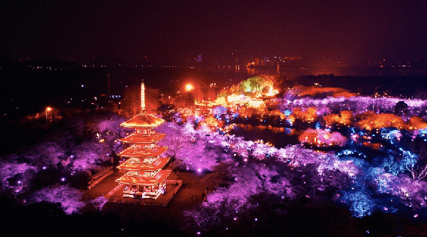 武汉以“相约春天赏樱花”为主线,营造全城赏花、全时赏花的氛围。武汉东湖樱园内栽种有上万株樱花,从3月初至4月上旬“接力”绽放。今年,“夜间赏樱”全新升级,樱花园内共设立有9000多套夜灯、500个灯笼。夜幕降临,唐风建筑群“曲院樱艳”和樱花海相互映衬,带给游客重回盛唐的梦幻体验。