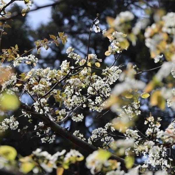 爬上树下的“云移石”,春风轻抚,梨花飘舞,细嗅之下,阵阵清香入鼻,暖阳下,花簇犹如白色的云朵,璀璨晶莹,小蜜蜂飞来飞去,别有一番景致。