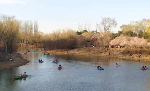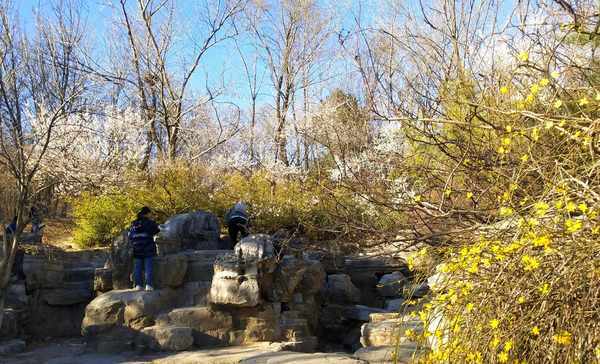 今天除了有些家长带孩子是去喂鱼、游船、娱乐,大部分人是去赏春花的。奥林匹克森林公园的桃花、迎春花、连翘,现在已经开了很多,春的气息非常浓厚。大家都争先恐后的在花丛中拍照留影,记录这美好时刻,留下这美丽的瞬间。