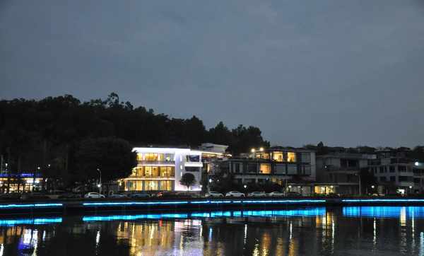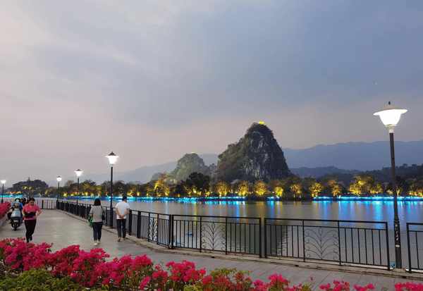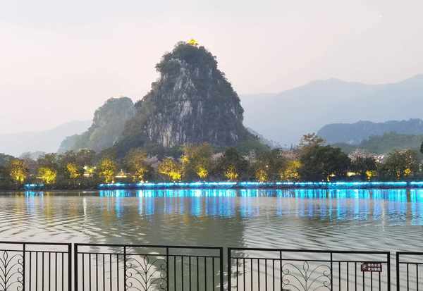 七星岩的主岩石室岩和天柱岩,在蓝色地平线的分割和淡黄色灯光的照射下,幽静、神秘、浪漫!