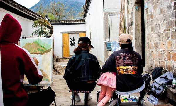 走进村庄,随处可见写生的学子,专注的描绘着远处的岱山、近处的徽派建筑、雕梁画栋的亭台楼阁、旌旗飘扬的酒肆瓦当……