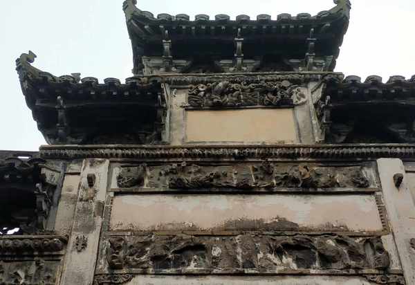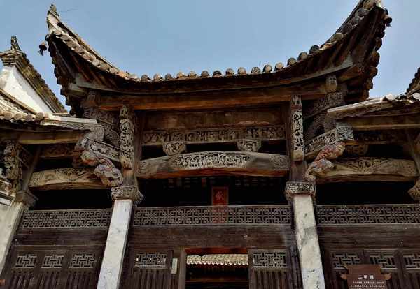 德公厅屋,四柱三层牌坊式门楼,五朵斗拱屋面,略带翘角分三层覆盖门楼,古朴典雅、雄浑大方。背面以镂雕手法雕出二龙戏珠、丹凤朝阳、鱼跃龙门、狮子滚绣球等吉祥图案,手法娴熟精美。