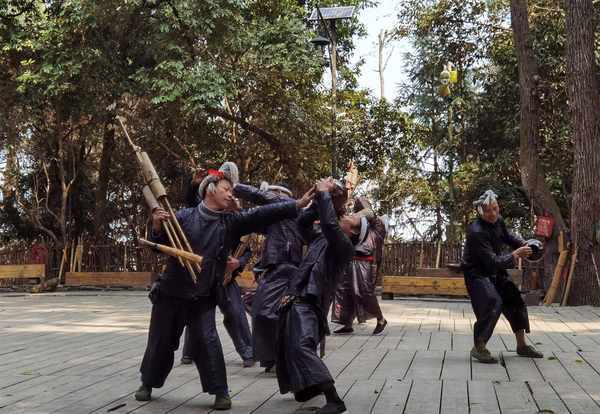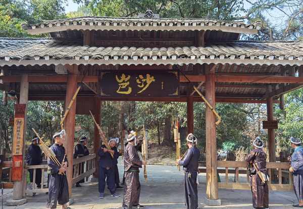 一身威武的岜沙汉子在寨门前吹奏芦笙、芒筒,岜沙姑娘跳着舞蹈。一曲笙歌奏毕,火枪对天鸣放,打开寨门迎宾入内。听说这个迎宾仪式是有时间的,来的时间不对就体验不到了。