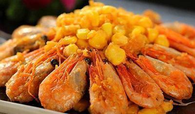 原料:大虾350克,嫩玉米100克,咸蛋黄糊50克,盐、糖、生粉、蛋黄、花生油各适量。