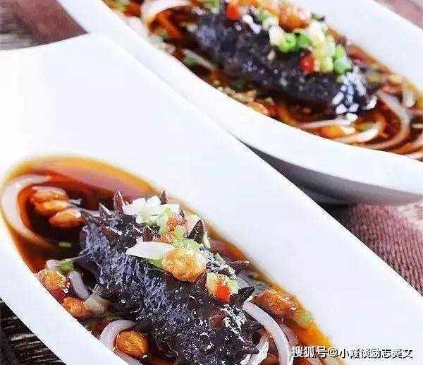 1。取四川红薯粉用冷水泡透,再放入沸水锅中煮至熟,捞出放在盘底。高压活海参洗净备用。另外取盐、红小米椒粉、姜米、香醋、白糖、酱油、鲜辣酱、花椒油、红油,调成酸辣酱备用。 2。锅内加入鲜汤,加盐、蚝油、姜片和洋葱,待海参入味时,盛入锅中,淋上酸辣酱,撒上葱花和油酥黄豆、香菜粉和芥末粉,上桌。
