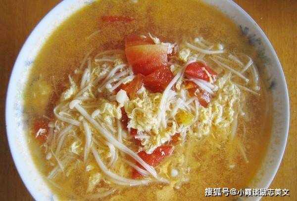 1、金针菇提前洗净,用清水浸泡3~4小时;用时取出,挤去水分,切成2、3段;葱剁成葱花;切碎的大蒜;鸡蛋打至表面出现一层小气泡;准备好水淀粉;将西红柿洗净,切成小方块;起锅,加入1茶匙植物油,爆香红葱头;加入切丁的西红柿,煮至出现红汤;加入一些开水。