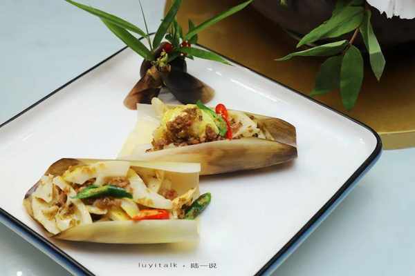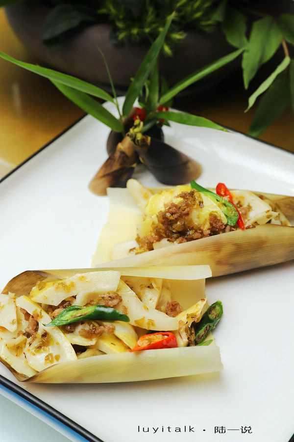 雪菜炒春笋苗 雪菜腌制金黄,同三层肉煸油炒香,与鲜笋一起,吊鲜提味。肉、笋、雪菜三味相投,融合演绎,清香油润,脆爽鲜甜,着实美味。