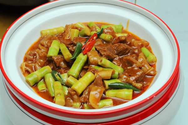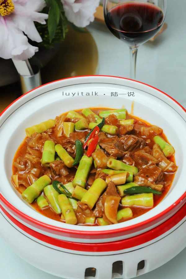 绿笋烧牛腩 大小一致的春笋切段,与牛腩配搭,周厨秘制的菌菇辣酱加持。笋鲜融合牛腩肉香,把浓郁在汤汁释放到极致,一勺浇饭,体验真正的一口入魂。绿笋爽脆,牛腩酥烂,连尽三碗,回味无穷。