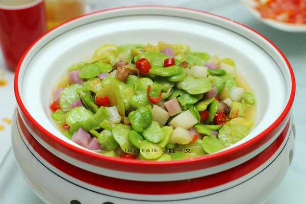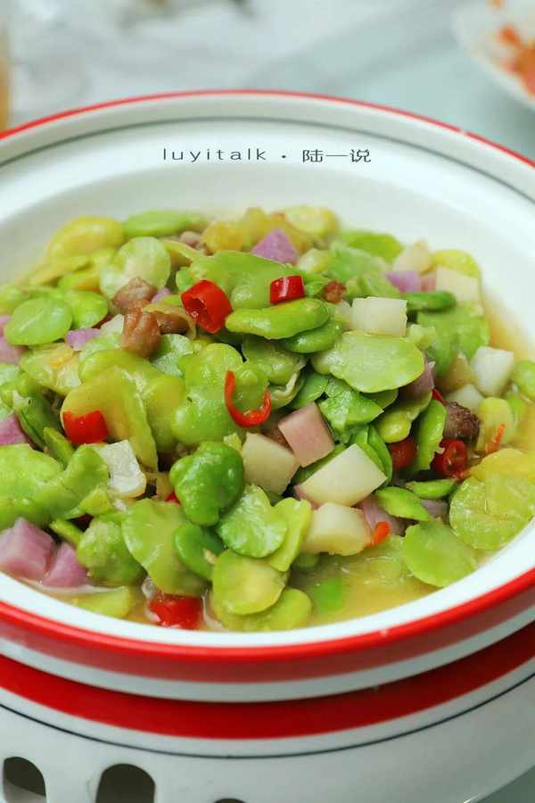 彩椒肉沫蚕豆煲 蚕豆是当之无愧的春日吃食,口感软糯,搭配淮山、肉沫、彩椒同锅炖煮,绿意央然,清香细腻。