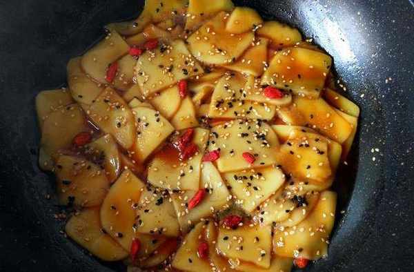 步骤五:黄粿煮软后汤汁煮浓稠,撒上白芝麻,黑芝麻,枸杞,红糖黄粿就煮好啦!
