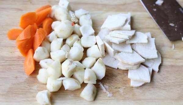 2.把胡萝卜削皮切块,马蹄也切块,粉葛削皮后,切成薄片,这样有利于粉葛容易煮熟煮透,如果是煲汤的话,时间比较久,就要把它切大块一些。