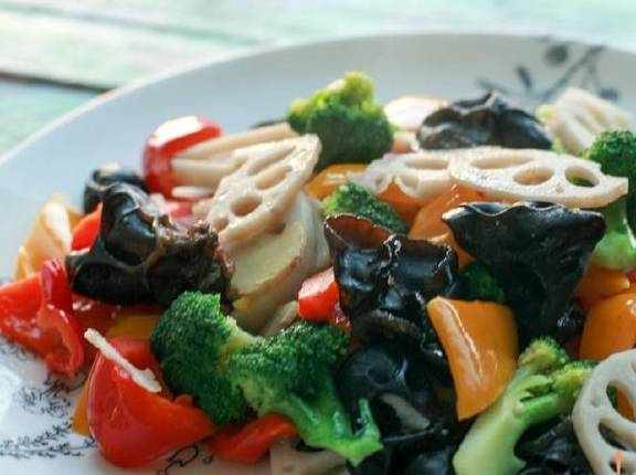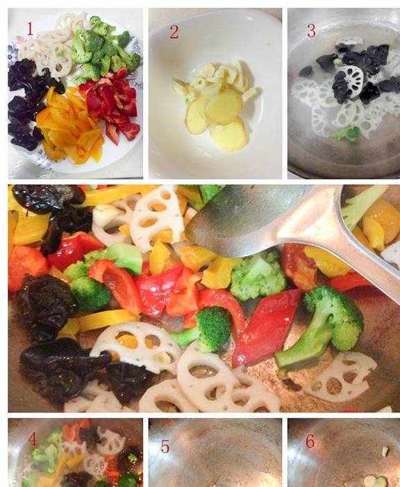 藕半根、彩椒红,黄各八个、木耳8朵、西兰花1/4个、、蒜、姜、盐少许
