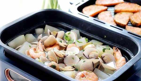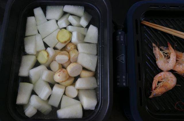 华凌新品仙贝多功能料理炉,咱天天都会想着怎样去折腾吃吃吃!第一次启动华凌新品仙贝多功能料理炉,就先来一个美食双飞宴——香芋冬瓜海鲜一锅端or玉桂烤南瓜,仙贝料理炉打成飞翔状后平放好,盖子那边用来煮食,料理炉加热很快,在冬季用来打火锅就不怕会冷场,在煮香芋冬瓜海鲜一锅端,由于是单独温控,主机那端也能同时开动,我就顺便做了个玉桂粉烤南瓜片,仙贝多功能料理炉用起来挺顺手了,好满意!