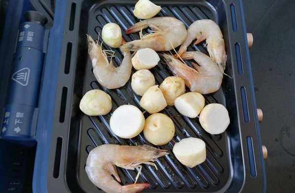 主机那端放下烤盘,下沙拉油烧热,加入虾,芋头煎5分钟左右,把虾盛起放一边待用