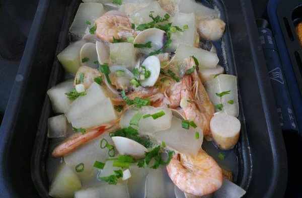 15分钟左右,冬瓜和芋头都熟了,加入白贝,煎过的大虾煮沸后,加入盐,放葱花即可