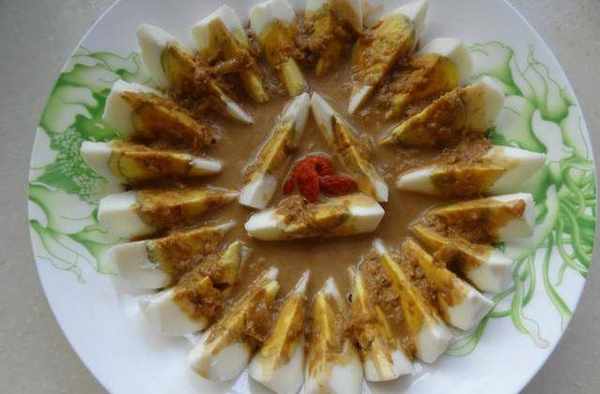 鸡蛋对半剖开,平均切成6瓣装盘就可以了,也可以切成自己想要的形状,最后放上枸杞点缀。蒜香、麻汁香、鸡蛋香,整个融为一体,美妙的滋味就在舌间,赶快试试吧!