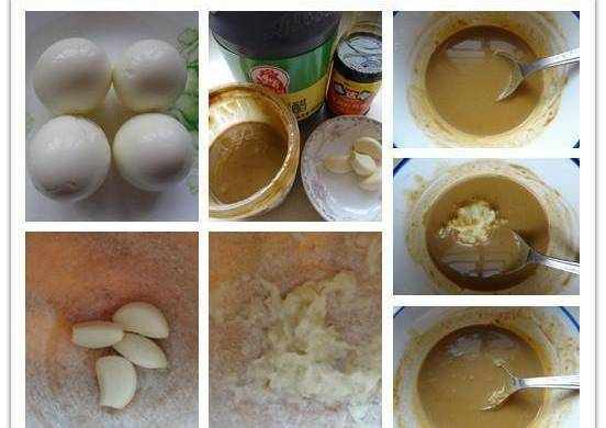 原料:煮熟的鸡蛋4颗,生抽、醋、麻汁、大蒜