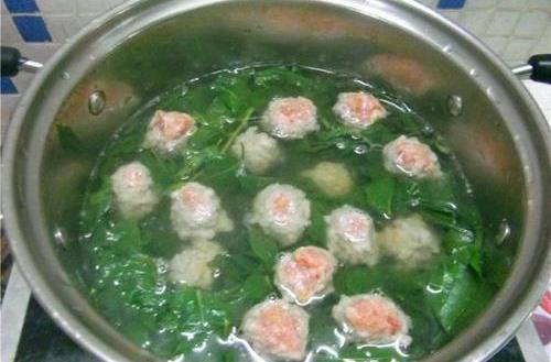 第四步:另架锅放水,煮沸后加入适量食盐,下入丸子烧煮片刻,接着将清洗干净的枸杞叶子放入,煮一会儿后淋入香油,关火,一锅鲜嫩的枸杞叶丸子汤就做好了。
